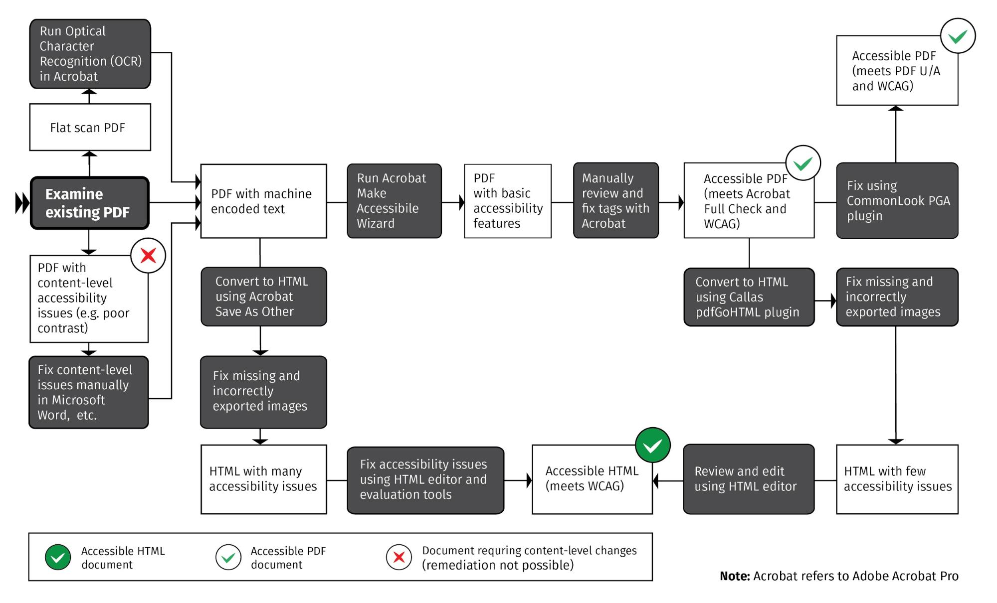 There are several different ways of converting PDF documents into HTML content. The choice of workflow will depend on whether the PDF is properly tagged and contains machine encoded text or is a document that is only partially tagged, contains no tags at all, or is a flat scan. We will review two different workflows in more detail.
