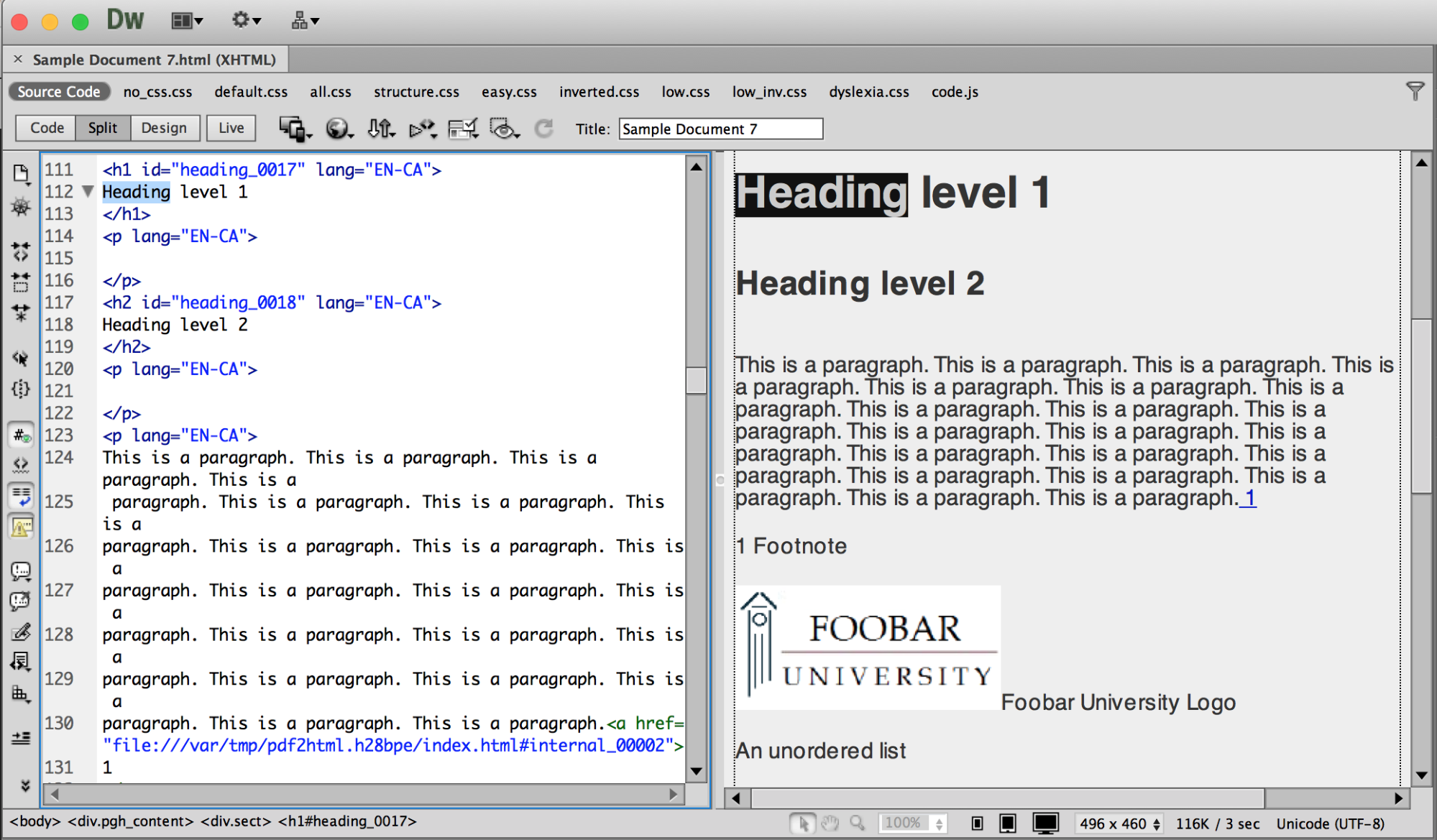 No matter what document type and export option is used, the resulting HTML document will require reviewing and editing. In this overview it is recommended that Dreamweaver is used for this purpose (see Reviewing and Modifying HTML content section). However, any text editor that processes code and markup can be used: