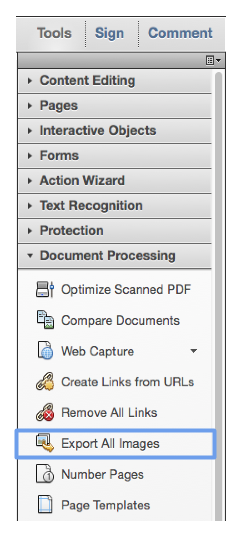 - In Adobe Acrobat Pro, select Tools > Document Processing > Export All Images.